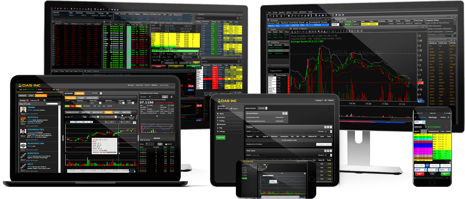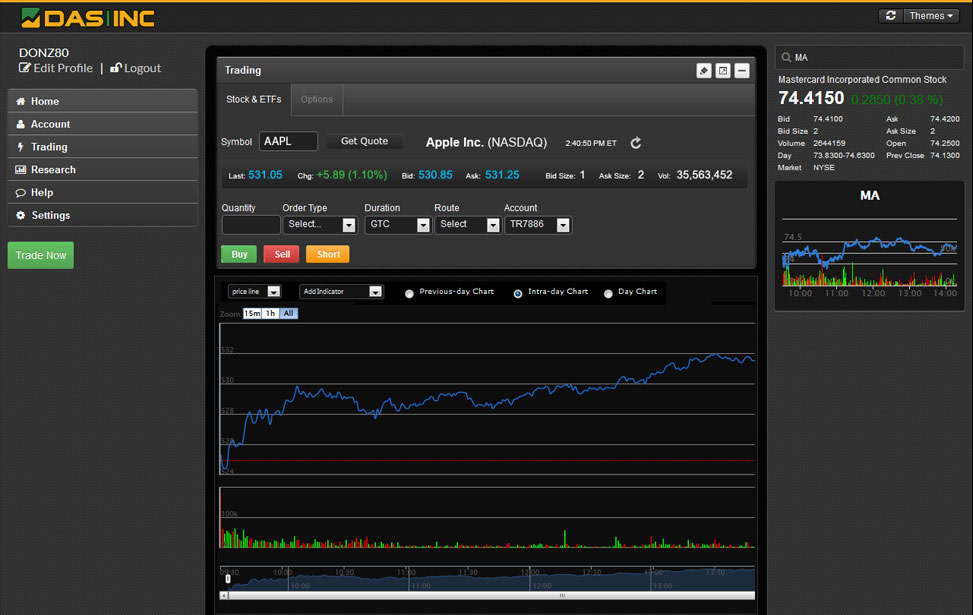 We are continually committed to improving the reliability of our software technology and have specifically designed our platform in a way that takes into consideration the scalability and needs of our clients. DAS Inc provides complete online brokerage solutions including direct access trading applications, browser-based trading, back-office order management systems, market data feeds, historical data, service bureau connectivity, FIX and API execution services.