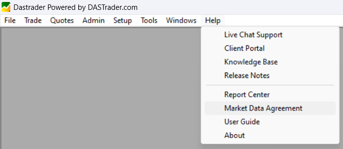 - In DASTrader Pro, navigate to the Market Data Agreement portal by clicking Help and then Market Data Agreement: