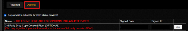 - In the portal, click on the Optional tab and then look for “THIRD PARTY DROP COPY CONSENT RIDER (Optional)” and click sign.