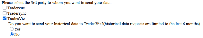 - On this page, read the agreement carefully. If you want to include your historical trade data, select Yes in the screenshot below and fill out the date range: